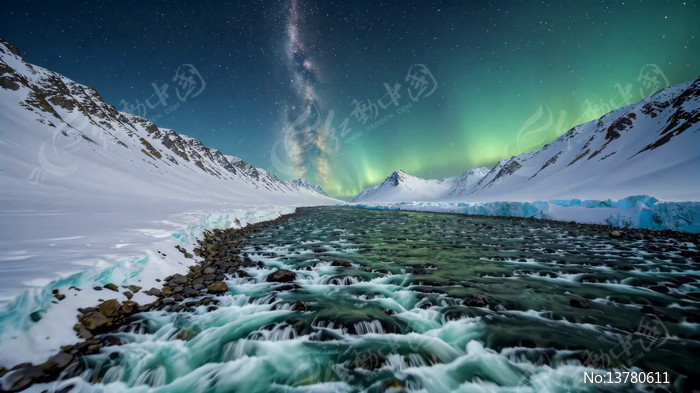 雪山河流夜空极光素材