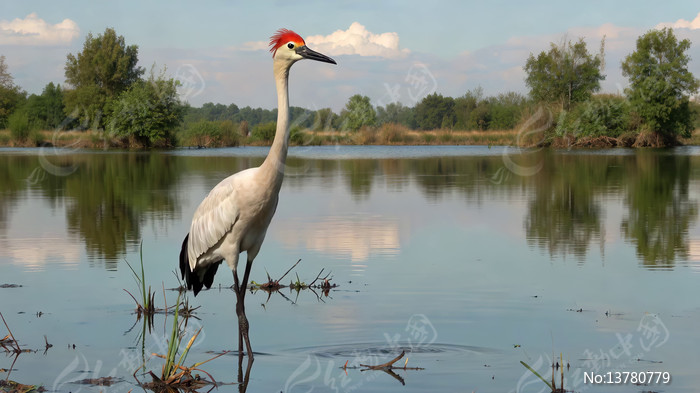 水边站立的红色冠羽鸟类
