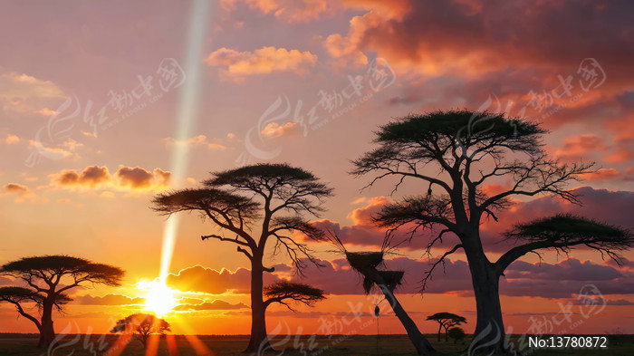 非洲草原日落树木景观