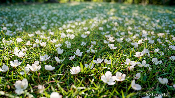草地散落白色花瓣景观