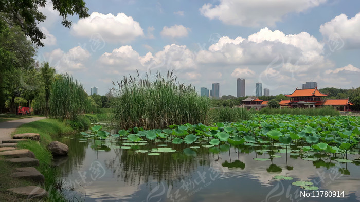 荷塘中式建筑自然风光
