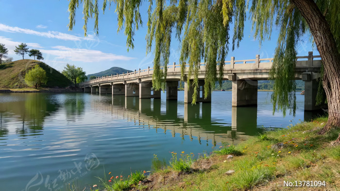 湖畔垂柳石桥自然风光