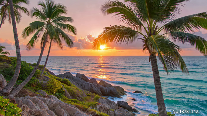海边日落与棕榈树风景