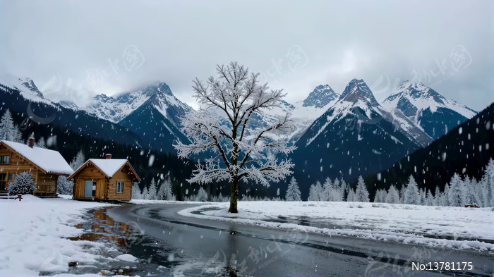雪山下木屋雪景