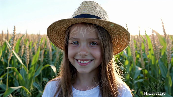 田野中戴草帽女孩微笑画面