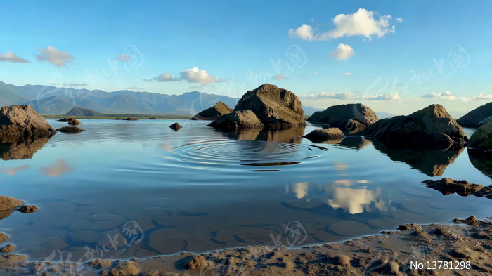 水边岩石与远山倒影风景