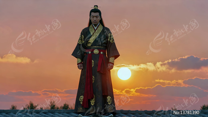 古装男子于日落时站立屋顶