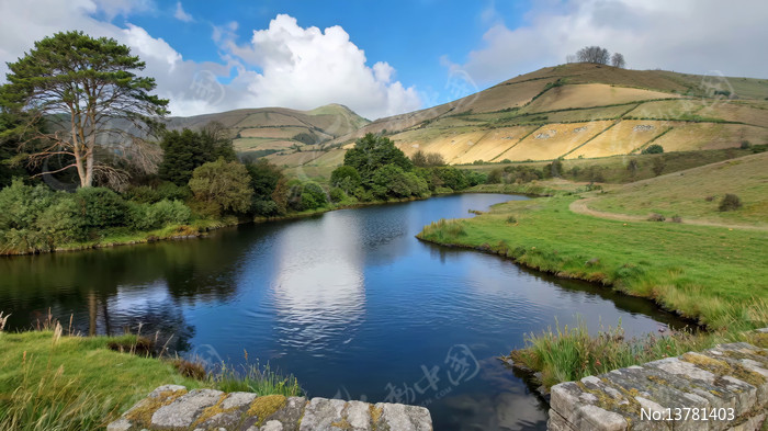 自然风光中的湖泊与山丘景观