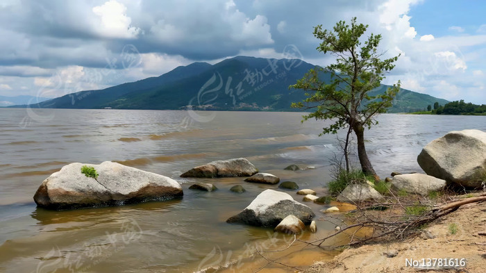 湖边岩石树木自然风光