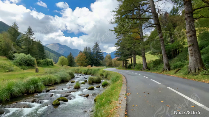山间公路旁溪流森林风景