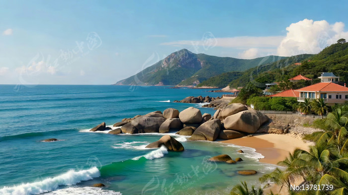 海边沙滩礁石与山景素材