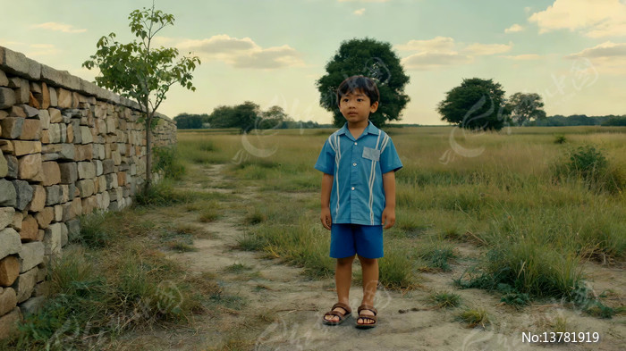 田野中站立的小男孩