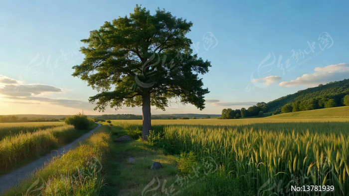 田野间大树与麦田风景