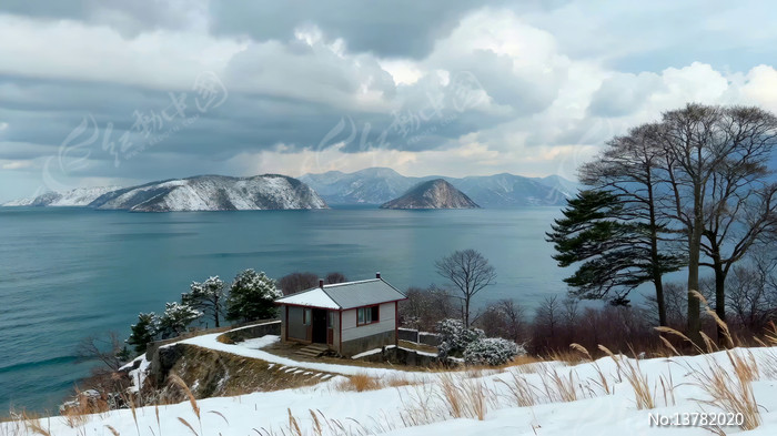 湖畔雪景小屋自然风光