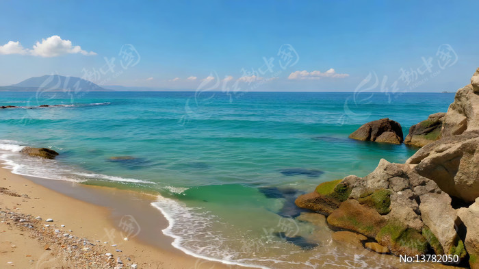 海边沙滩礁石与海浪景象
