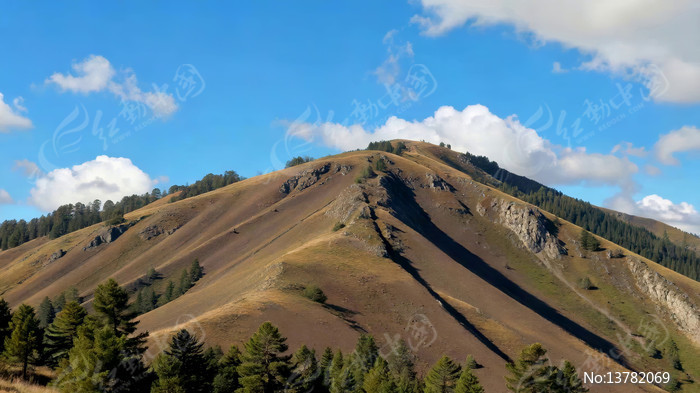 蓝天白云下的山脉树林景观
