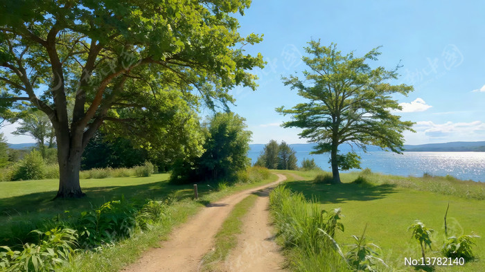 湖边草地树木乡间小路风景