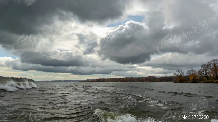 湖面波涛与阴云密布天空