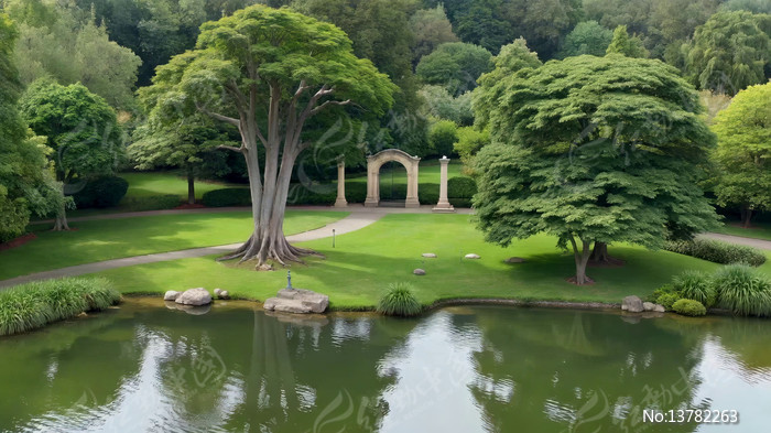 公园池塘旁绿树及拱门景观