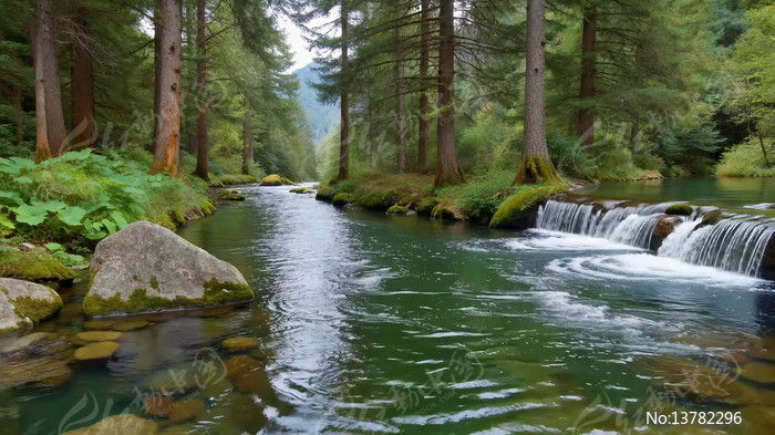 森林中溪流瀑布自然景观