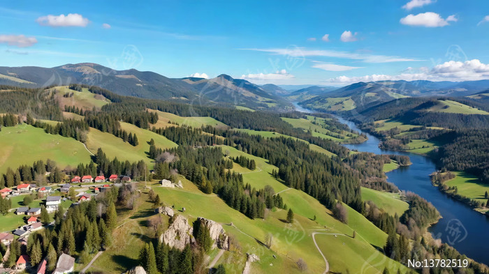 航拍山间河谷与村落风光