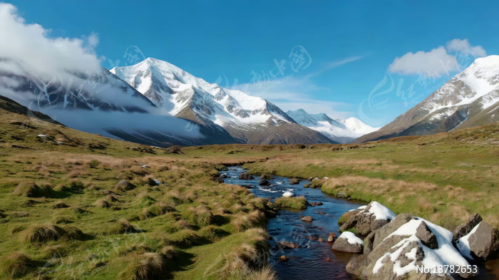 雪山下的溪流草地风景