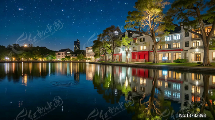 湖边建筑夜景倒影