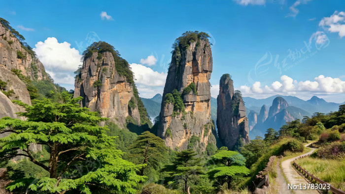 山间奇峰与林间小路风景