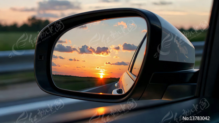 汽车后视镜中的夕阳景色