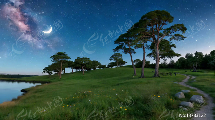 夜晚星空下的草地树林景观