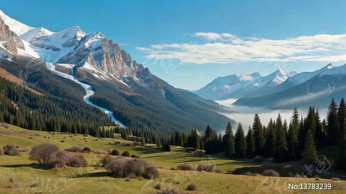 雪山下的山林草地自然风光