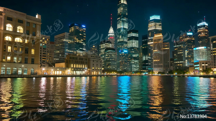城市夜景河畔摩天大楼景观