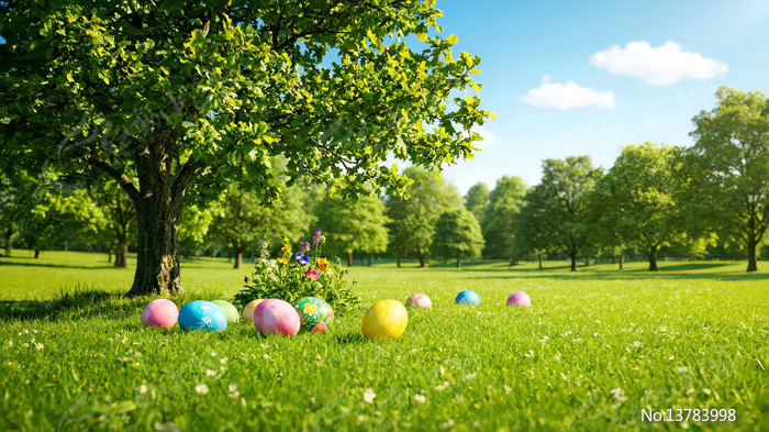 草地树木下的彩色复活节彩蛋