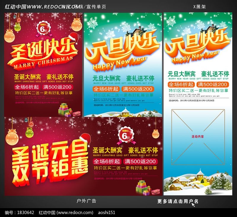 红动中国提供原创圣诞元旦促销广告设计下载,作品以圣诞促销为主题而设计,可作为圣诞促销海报,圣诞节展架,元旦节展架,诞旦有礼,节日展架等主题图片使用,圣诞元旦促销广告设计,编号1830642,格式PSD,尺寸300x400毫米,大小91.93 MB,欢迎会员进行下载。