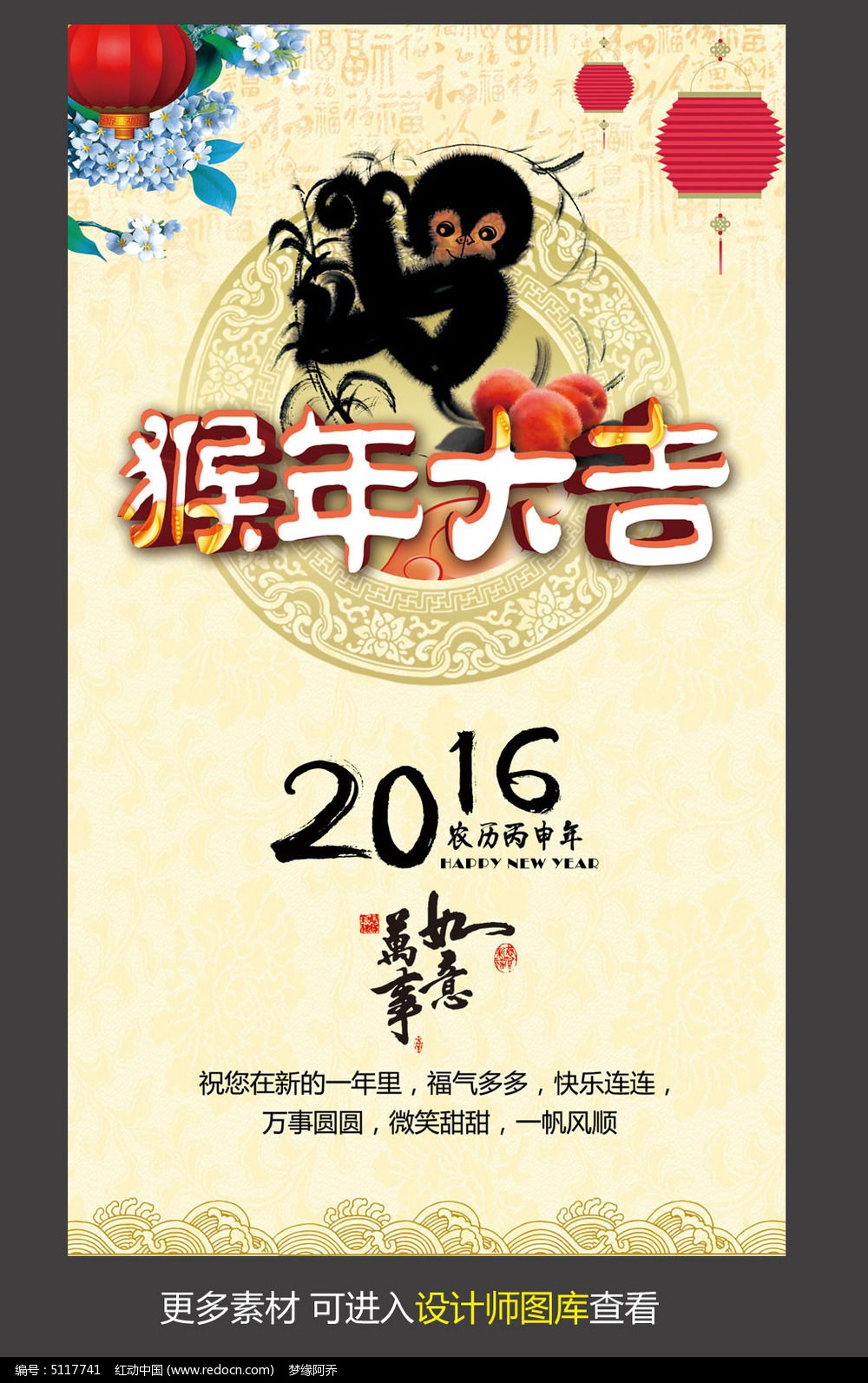 红动中国提供原创2016猴年大吉新年海报设计下载,作品以猴年促销为主题而设计,可作为猴年促销海报,猴年宣传海报,春节海报,猴年背景,猴年大吉等主题图片使用,2016猴年大吉新年海报设计,编号5117741,格式PSD,尺寸350x600毫米,大小118.62 MB,欢迎会员进行下载。