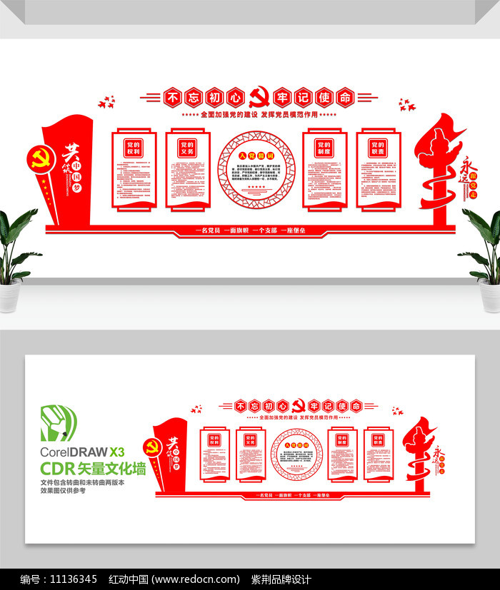 红动中国提供原创大气党建文化墙设计下载,作品以党建为主题而设计,可作为党员活动中心,文化墙设计 ,党建背景墙,党建活动室,党建文化墙等主题图片使用,大气党建文化墙设计,编号11136345,格式CDR,尺寸1500x500毫米,大小1.01 MB,欢迎会员进行下载。