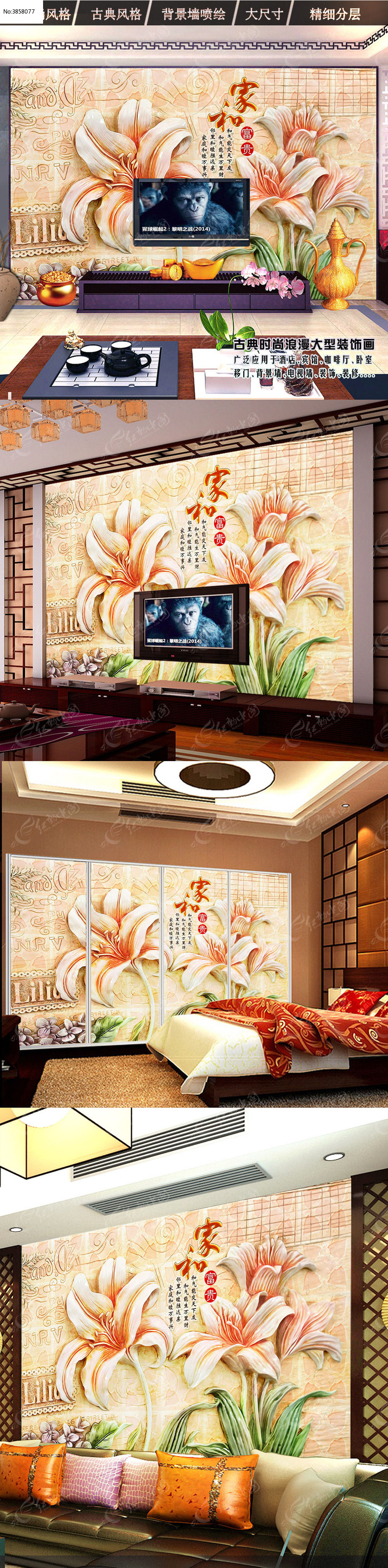 当前位置:设计网站>平面广告>背景墙|装饰画>背景墙> 家和富贵立体浮雕壁画百合花开电视背景墙 家和富贵立体浮雕壁画百合花开电视背景墙